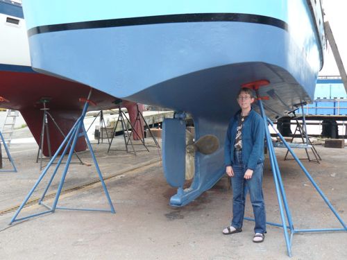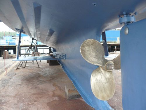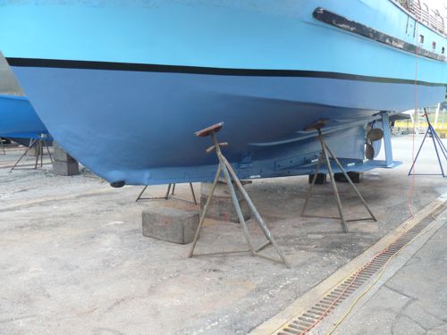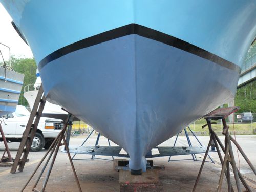 Shown below are several pictures of the Moody Blue taken during a recent haul out. Clearly seen are the batwing stabilizers, forward scanning sonar, and rudder and wheel.